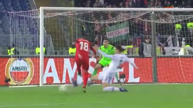 Il Siviglia che riparte, tre quattro passaggi e gli spagnoli entrano con tutto il pallone in rete, con i Laziali lenti e macchinosi nel provare a recuperare la posizione.